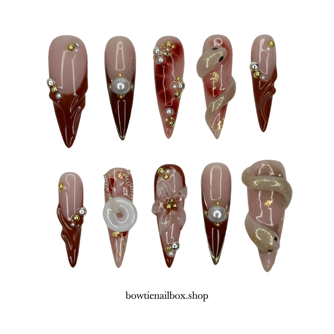 Embrace an aura of oriental mystery with this breathtaking stiletto set. Featuring a 3D sculpted serpent, luxurious jade-inspired charms, and deep crimson gradients, these nails combine mythical elegance with high-fashion drama. Perfect for the woman who commands attention with a whisper.