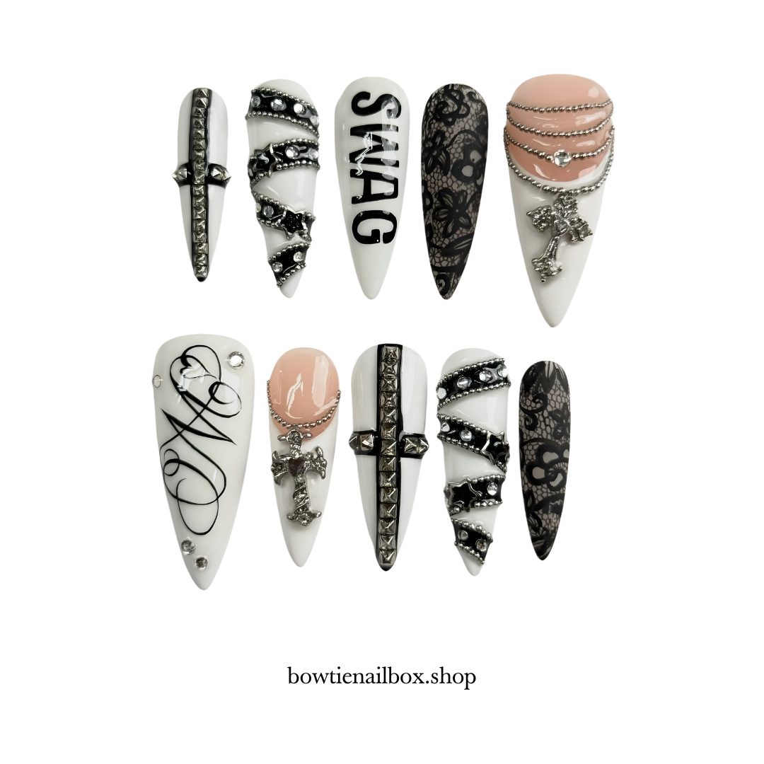 This set is for the ultimate street-style baddie. Combining bold "SWAG" typography with delicate black lace patterns and chrome cross charms, it’s the perfect mix of "tough" and "sexy" to complete your fit.