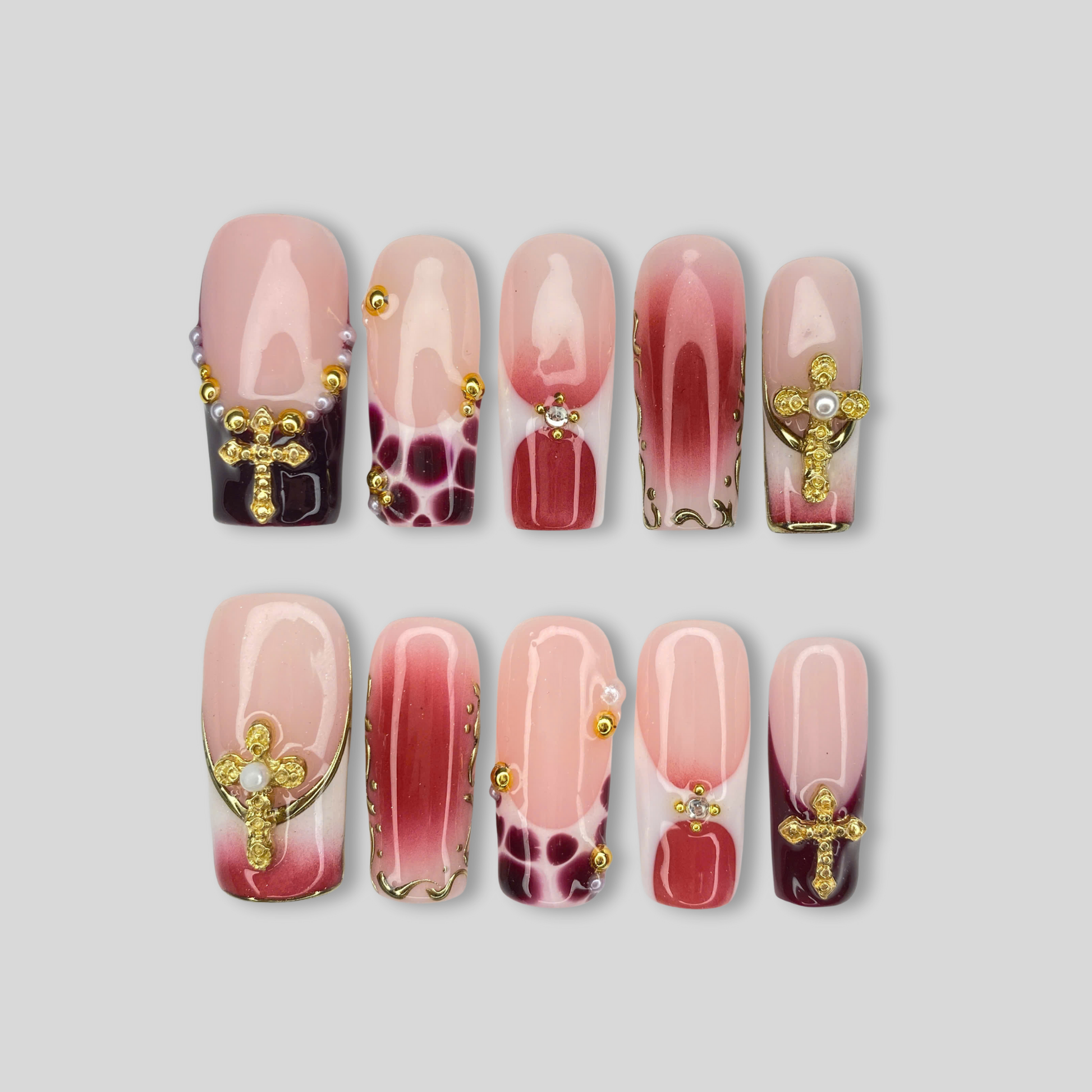 Gradient crimson & blush ombré base with gold details